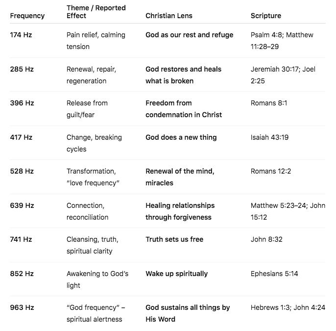 Note: The scriptures listed here are not "proof-texts" about frequencies. Instead, they reflect biblical themes that the Holy Spirit may apply to our lives in different seasons. The frequencies may provide a quiet backdrop for prayer or reflection, but true peace, restoration, and awakening come from God Himself.